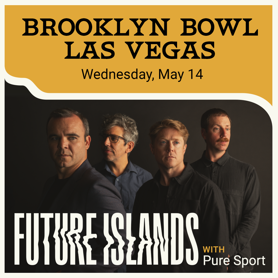 Future Islands brings their signature synth-pop sound and emotionally charged performances to Brooklyn Bowl Las Vegas. Known for their intense live shows and frontman Samuel T. Herring's distinctive dance moves and passionate delivery, Future Islands creates an unforgettable blend of post-wave melodies, electronic rhythms, and raw emotional energy. The Baltimore-based band has earned widespread acclaim for their compelling performances that combine innovative electronic music with deeply personal lyrics and theatrical stage presence.