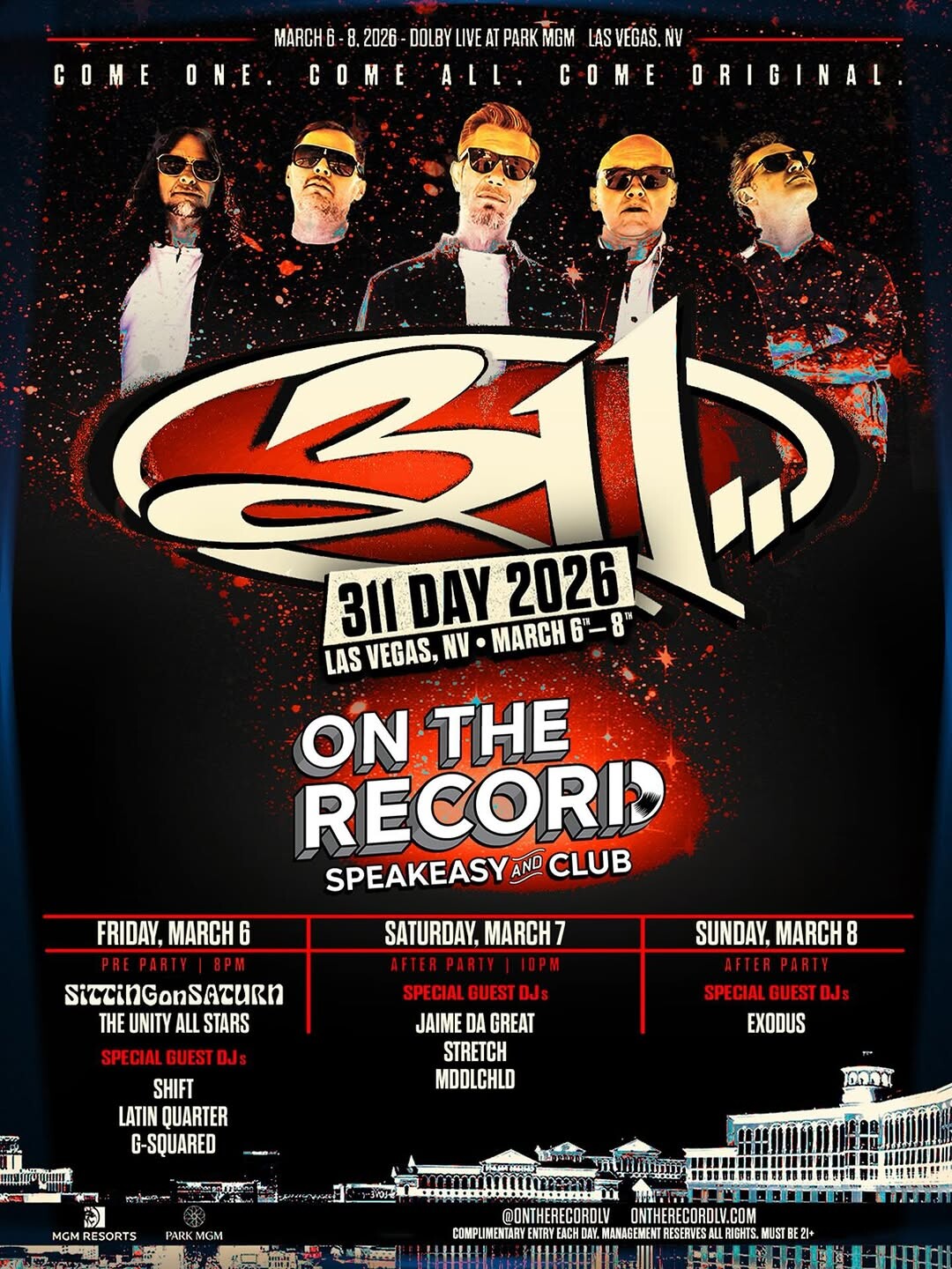 The 311 Welcome Party brings the spirit of the iconic rock band's fanbase to On The Record, the vinyl-inspired speakeasy tucked inside Park MGM. This gathering celebrates the community that's grown around 311's decades-long career, offering fans a chance to connect before or around one of the band's Las Vegas appearances. The venue's nostalgic record store aesthetic—complete with listening booths and walls lined with album covers—creates an intimate setting that feels right at home with 311's devoted following.