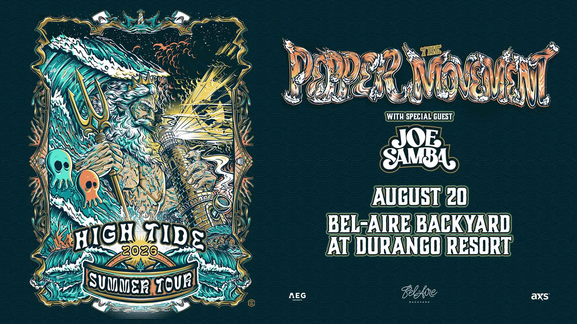 Pepper brings their signature blend of reggae, rock, and punk energy to the Durango Casino & Resort, joined by The Movement for a night of good vibes and sun-soaked sounds. The Hawaiian trio has been delivering their laid-back but high-energy performances for over two decades, mixing catchy melodies with a California-meets-island aesthetic that's made them favorites on the summer festival circuit. Their music balances between chill reggae grooves and more aggressive rock elements, creating a sound that's distinctly their own.