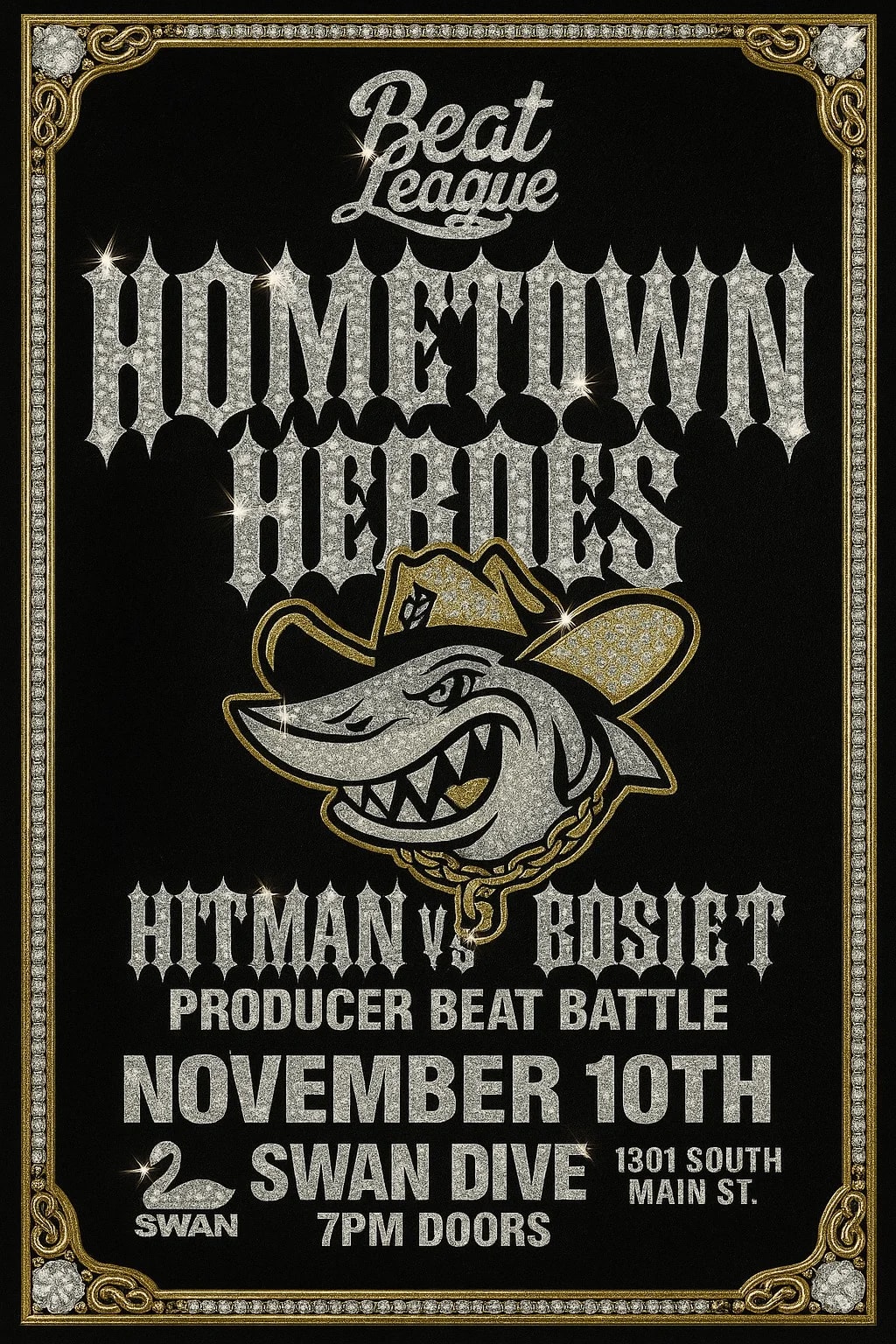 The Beat League Hometown Heroes Producer Beat Battle at Swan Dive brings local music production talent into the spotlight. Producers showcase their original beats in a competitive yet supportive environment, with each participant getting their moment to demonstrate their unique sound and production techniques. The audience and judges evaluate each beat based on creativity, sound quality, and overall impact.
