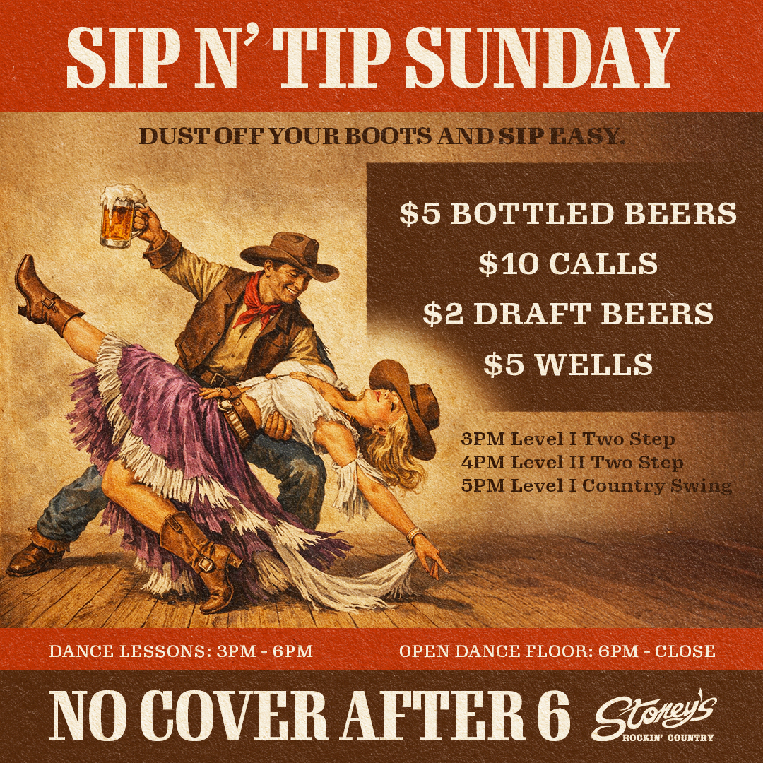 Sip' N' Tip Sundays at Stoney's Rockin' Country brings together couples looking to learn country dance moves in a relaxed, social atmosphere. The evening kicks off with structured dance lessons designed for partners of all skill levels, whether you're complete beginners or just looking to brush up on your two-step and line dancing techniques. Professional instructors break down the moves in an approachable way that takes the intimidation out of learning.