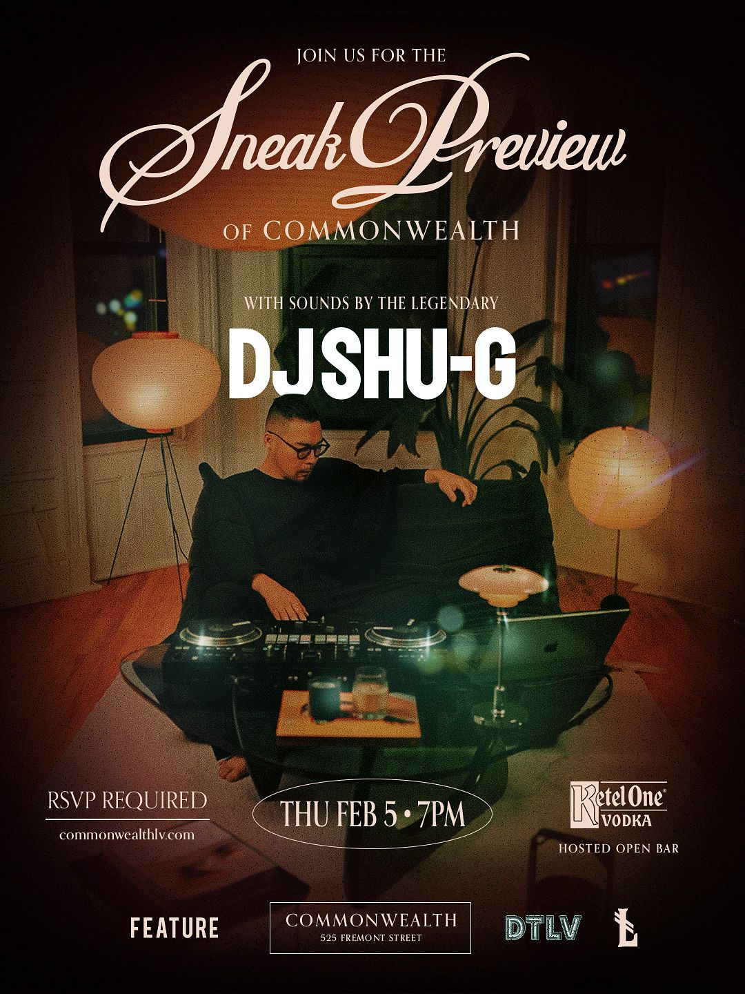 The "sneak preview" aspect suggests this might be a preview of a new residency, showcase, or upcoming event series at the downtown venue. Commonwealth's rooftop offers a breather between sets, with iconic views of the Fremont East district lighting up the night. The open bar format means you can focus on the music and the scene without worrying about tabs, making it easy to settle in and enjoy the full experience from evening into late night.